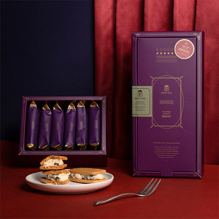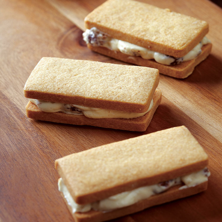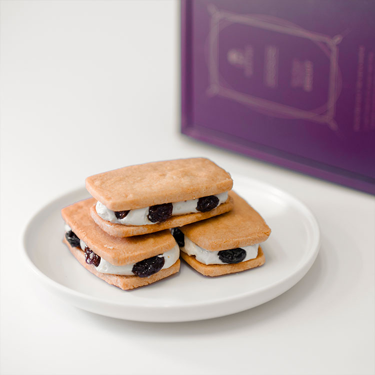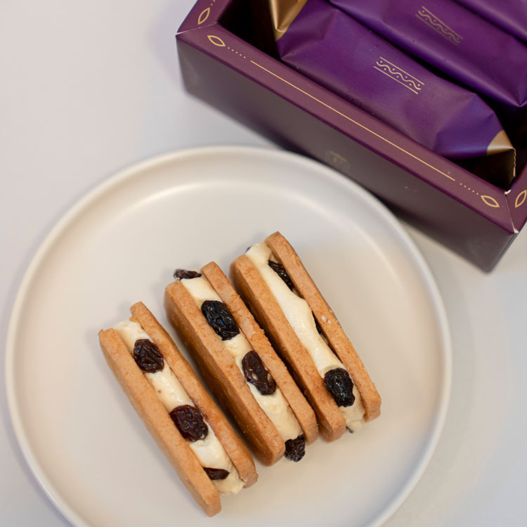 再夾入法國天然發酵奶油與日本菓子專用麵粉經過一至兩天發酵製成獨特香氣的奶油餅乾,組成風味獨特的「蘭姆葡萄餅」。