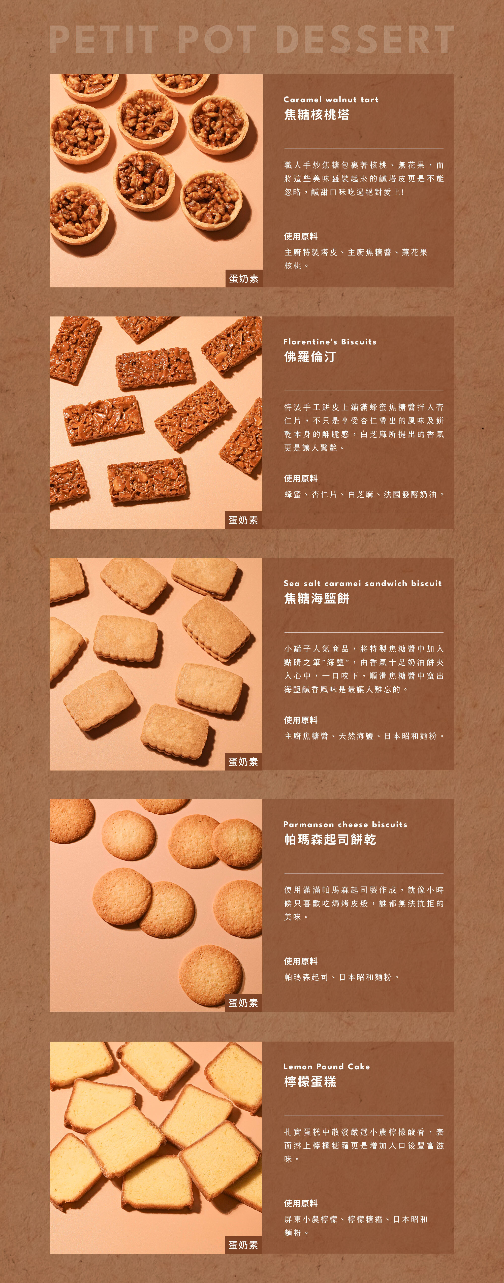 焦糖海鹽餅: 麵粉、奶油、糖、蛋、杏仁粉、鮮奶油、葡萄糖漿、鹽。過敏原資訊:含有蛋、小麥、堅果及牛奶製品