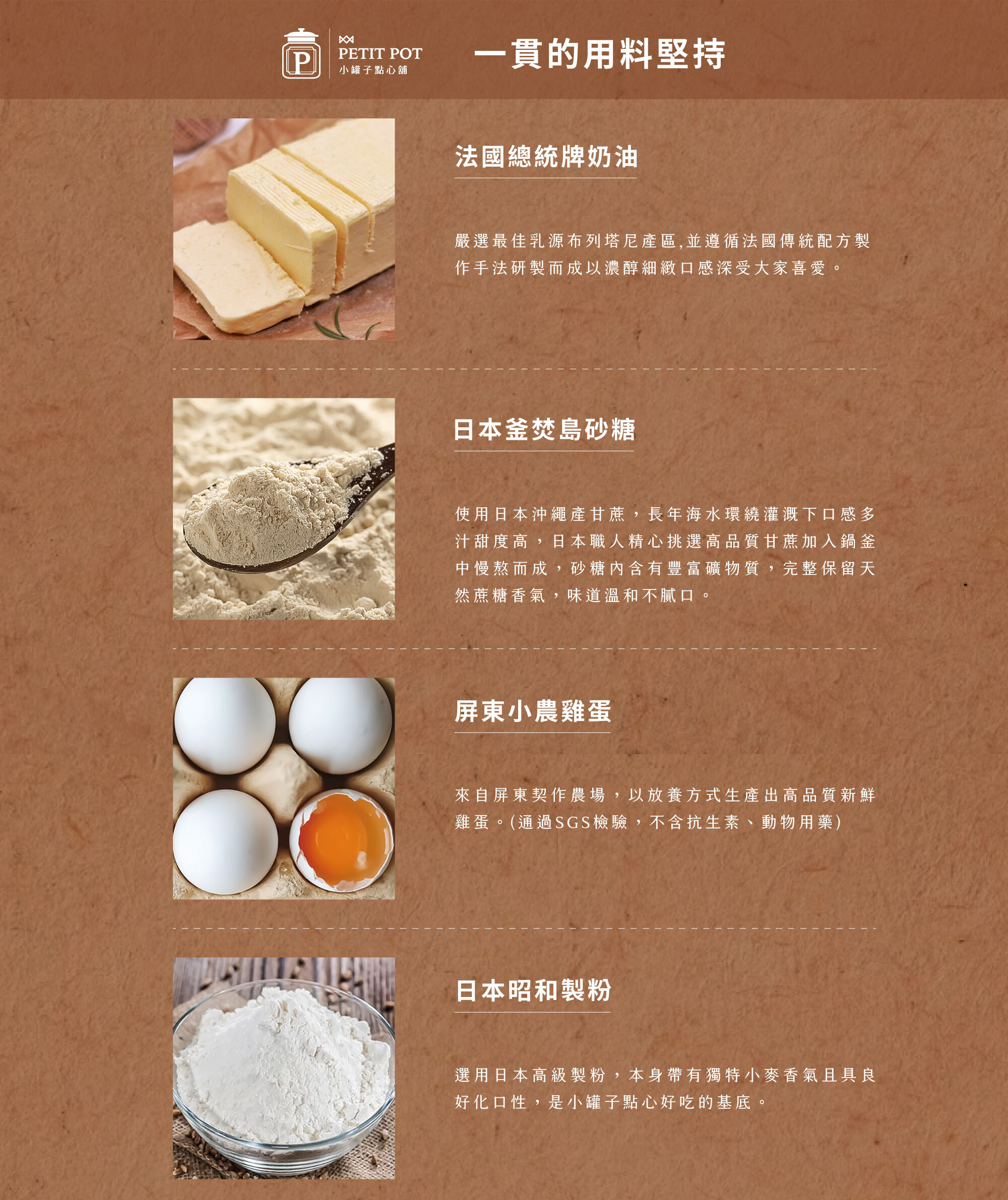 法國總統牌天然發酵奶油、日本釜焚島砂糖、屏東小農雞蛋、日本昭和麵粉