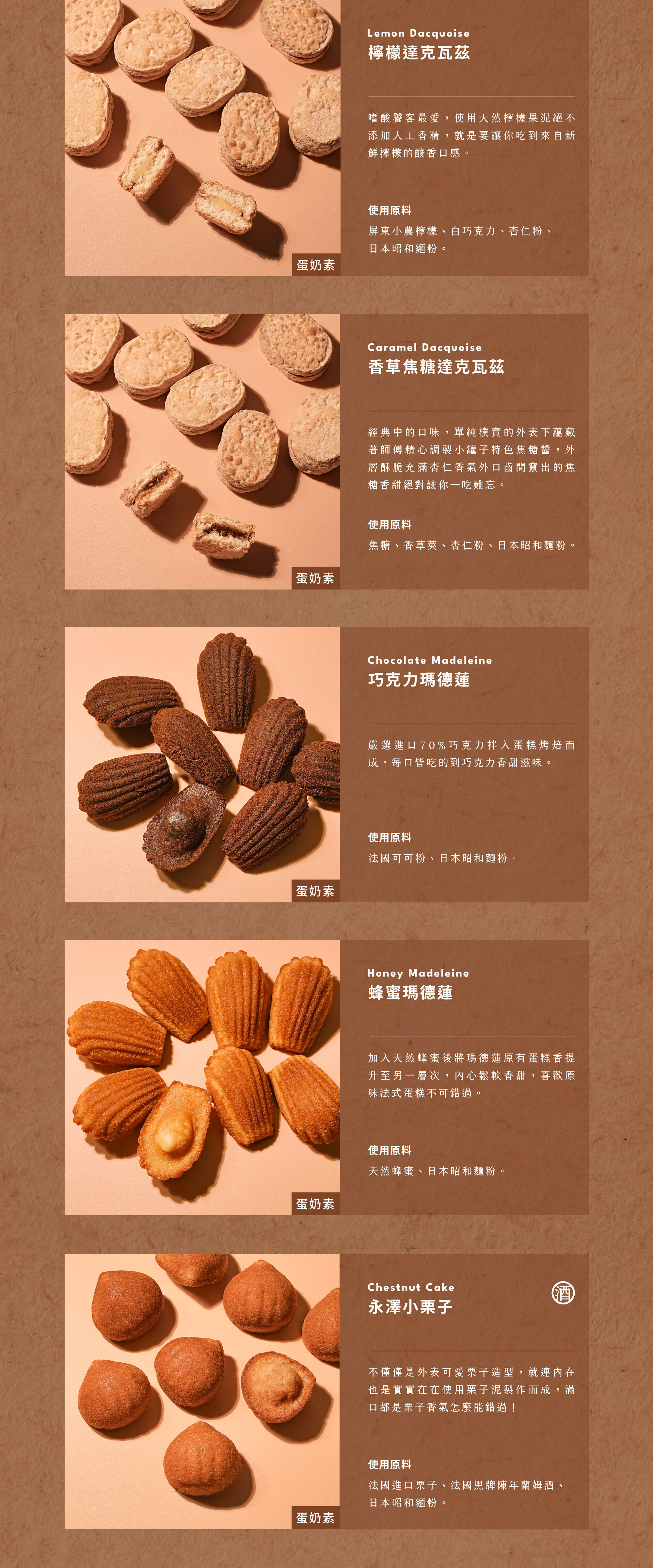 巧克力瑪德蓮: 奶油、糖、轉化糖、蛋、麵粉、無鋁泡打粉(磷酸二氫鈣、碳酸氫鈉、玉米澱粉)、鹽、檸檬皮、可可粉。過敏原資訊:含有蛋、小麥及牛奶製品