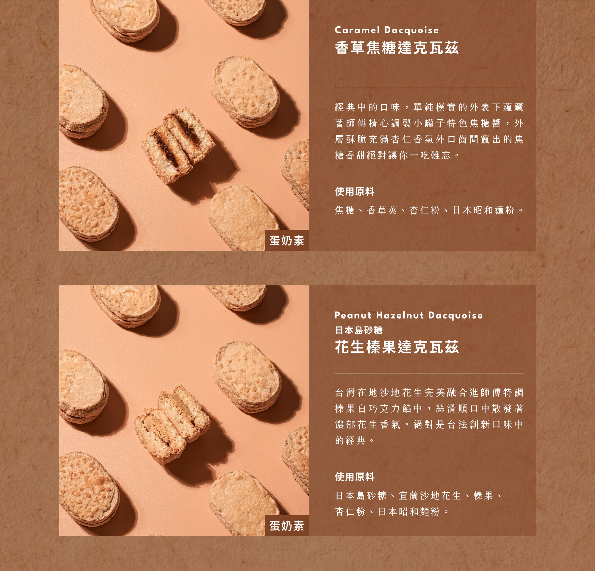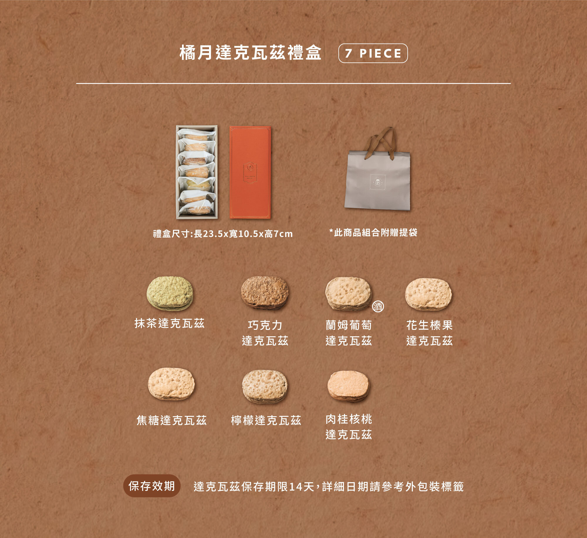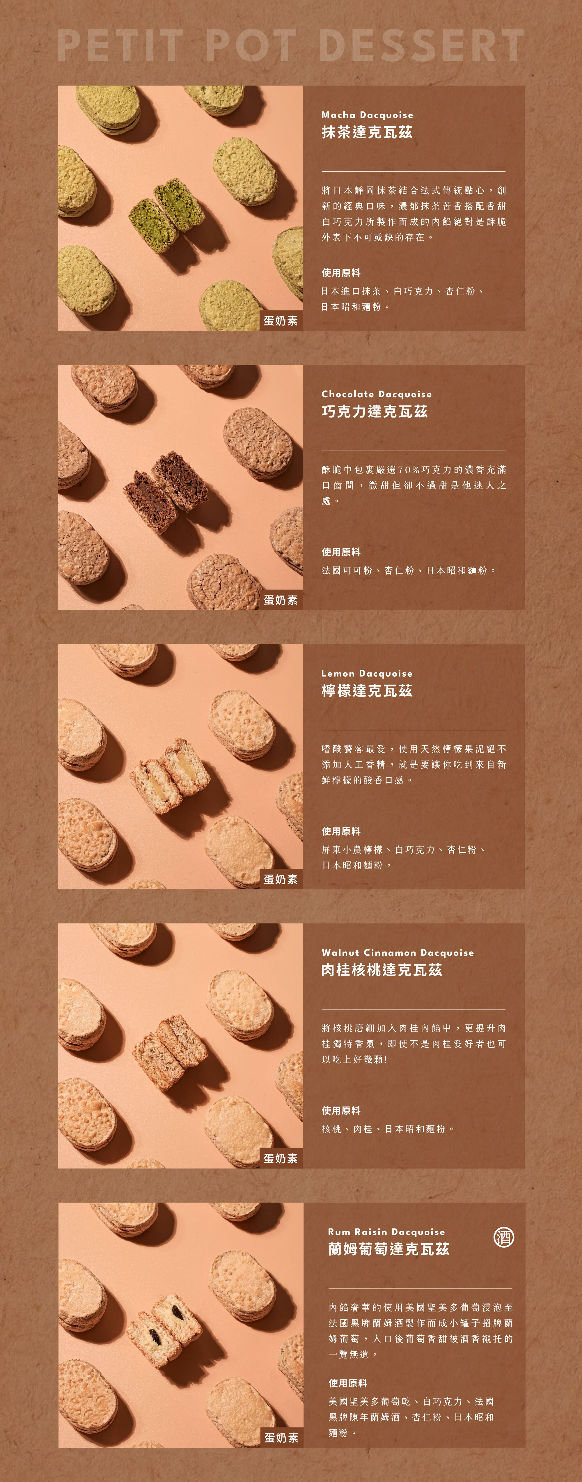 禮盒甜點 : 檸檬達克瓦茲 x1、香草焦糖達克瓦茲x1、巧克力達克瓦茲x1、 花生榛果達克瓦茲x1、抹茶達克瓦茲x1、肉桂核桃達克瓦茲x1、蘭姆葡萄達克瓦茲x1