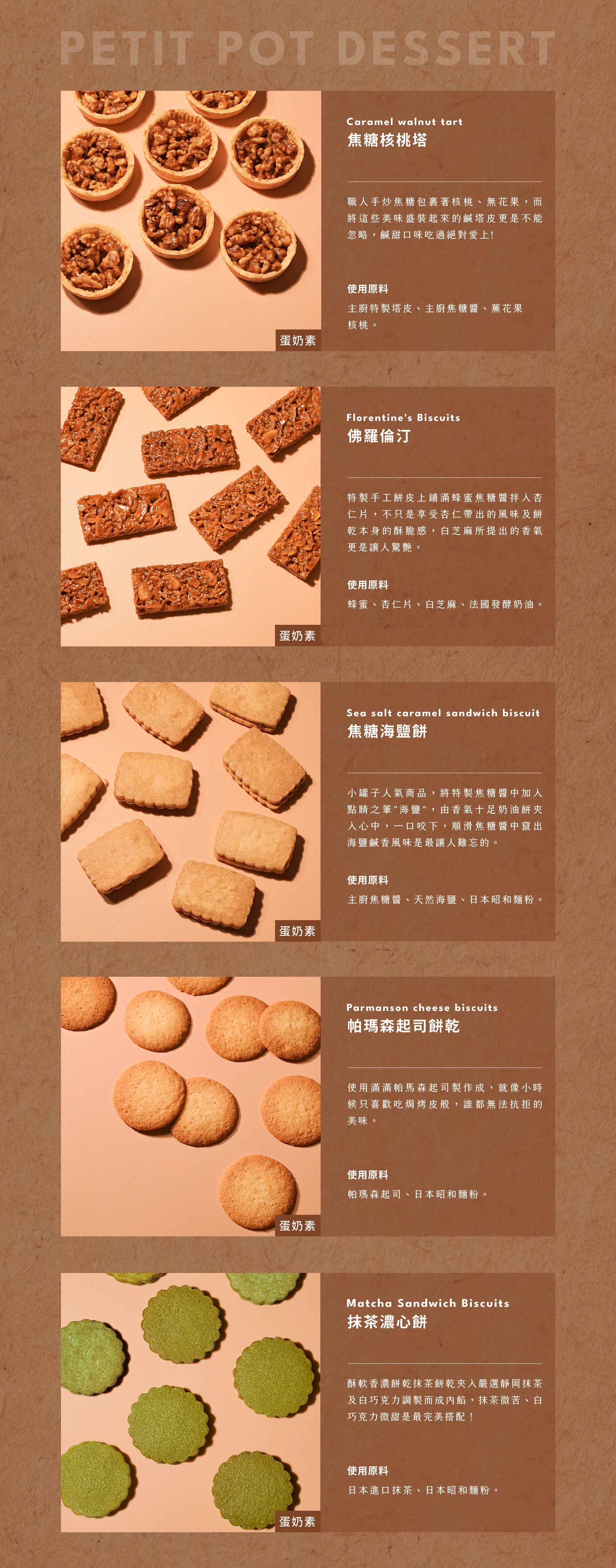 焦糖海鹽餅: 麵粉、奶油、糖、蛋、杏仁粉、鮮奶油、葡萄糖漿、鹽。過敏原資訊:含有蛋、小麥、堅果及牛奶製品